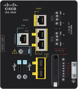 The ISA-3000-2C2F-K9 in Packettracer has two 1GbE SFP ports, two 10/100/1000Base-T ports and a management port.