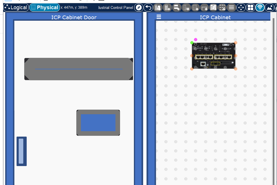 This container initially shows its sub-containers: the door (left side) and the cabinet (right side). The door is initially open, but it can be closed and re-opened by clicking on its rectangular handle. When the door is open, any devices shown on it will be rendered in their “back-side” view.